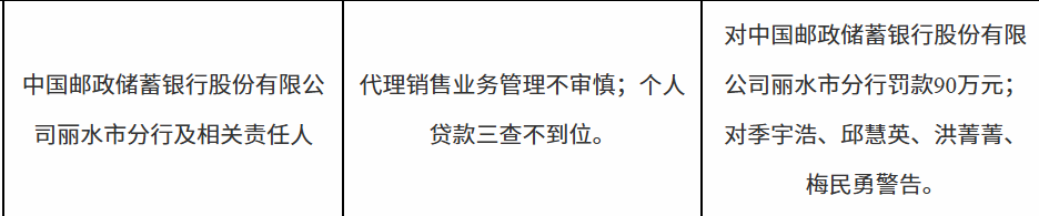 12月11日配资实盘平台排名前十,国家金融监督管理总局丽水监管分局行政处罚信息公开表显示,中国邮政储蓄银行股份有限公司丽水市分行及相关责任人因代理销售业务管理不审慎、个人贷款三查不到位被罚款90万元;季某浩、邱某英、洪某菁、梅某勇被警告。